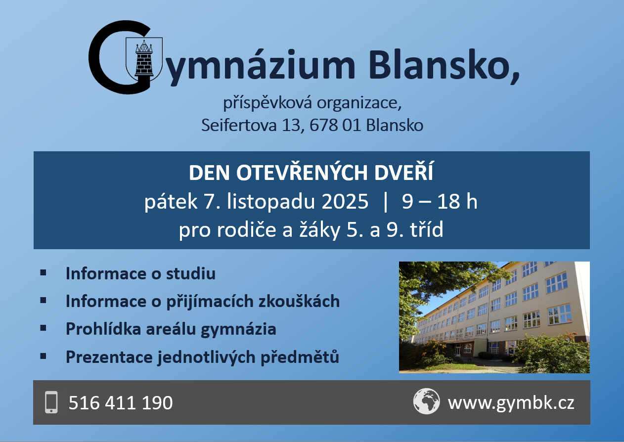 Ve dnech 16. -17. 9. 2025 se u nás na Gymnáziu v Blansku uskutečnily Studentské volby do Poslanecké sněmovny Parlamentu ČR. Tuto možnost již tradičně žákům SŠ nabízí organizace Člověk v tísni v rámci vzdělávacího programu Jeden svět na školách. Hlavním účelem voleb je seznámit studenty s principem demokratického hlasování...