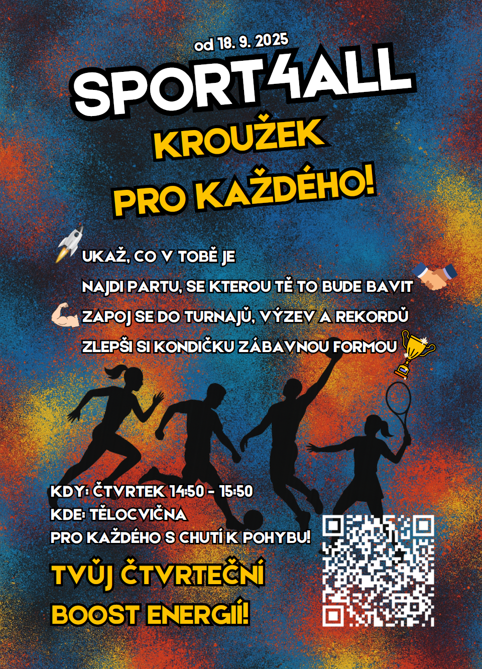 Od září 2025 otevíráme na našem gymnáziu nový sportovní kroužek SPORT4ALL. Je určený pro všechny studenty se zájmem o pohyb a jeho cílem je rozvoj všestranných pohybových dovedností prostřednictvím moderních tréninkových metod a sportovních her. Kroužek bude probíhat každý čtvrtek od 14:50 do 15:50 v tělocvičně a na dalších sportovištích v blízkosti školy. Zájemci se mohou přihlásit online přes formulář v týmu studentů v Teams.