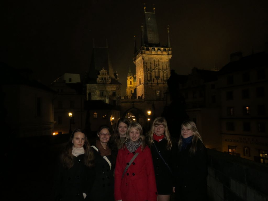 Mezitím se trochu umoudřilo počasí, takže jsme si dopřály ještě malou procházku noční Prahou. Na osvětleném a téměř liduprázdném Karlově mostě jsme si přečetly několik latinských nápisů a pokochaly se pohledem na zamlžené Hradčany. Nějakou latinu jsme našly i na Staroměstském náměstí, například nápis na radnici by jistě zvládli přeložit všichni letošní latináři: DIGNITATIS MEMORES - AD OPTIMA INTENTI. Zdalipak se jím pražští radní řídí? . Na jeden nápis na Staromáku si můžete dokonce šlápnout vlastní nohou – MERIDIANUS QUO OLIM TEMPUS PRAGENSE DIRIGEBATUR (je to tam pro jistotu napsáno i česky, až ho budete hledat