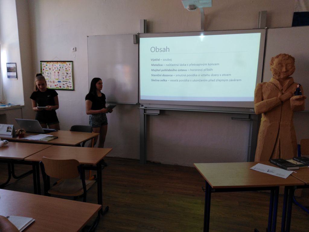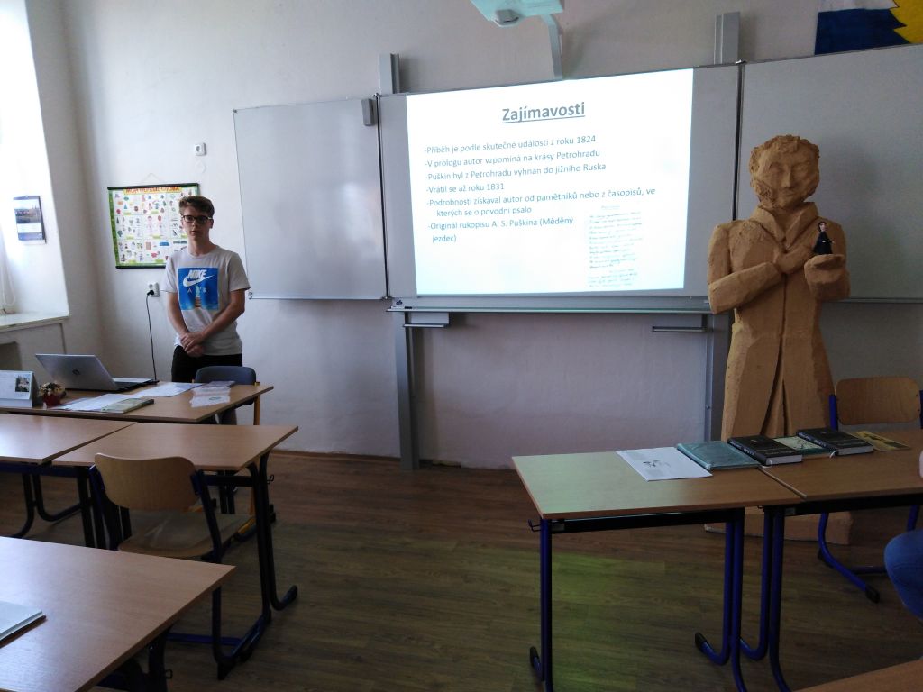 Každý ze zúčastněných přispěl svou troškou do mlýna - podle zadaných úkolů vyprávěli v režii paní učitelky Konečné o Puškinově životě a o jeho vybraných dílech. Nejednalo se vědecké rozbory, ale spíš o zprostředkování dojmů a pocitů, které naši mladí „puškinologové“ zažívali při čtení děl ruského velikána. Každý vybral ze „svého“ díla rovněž citaci, která ho zaujala.