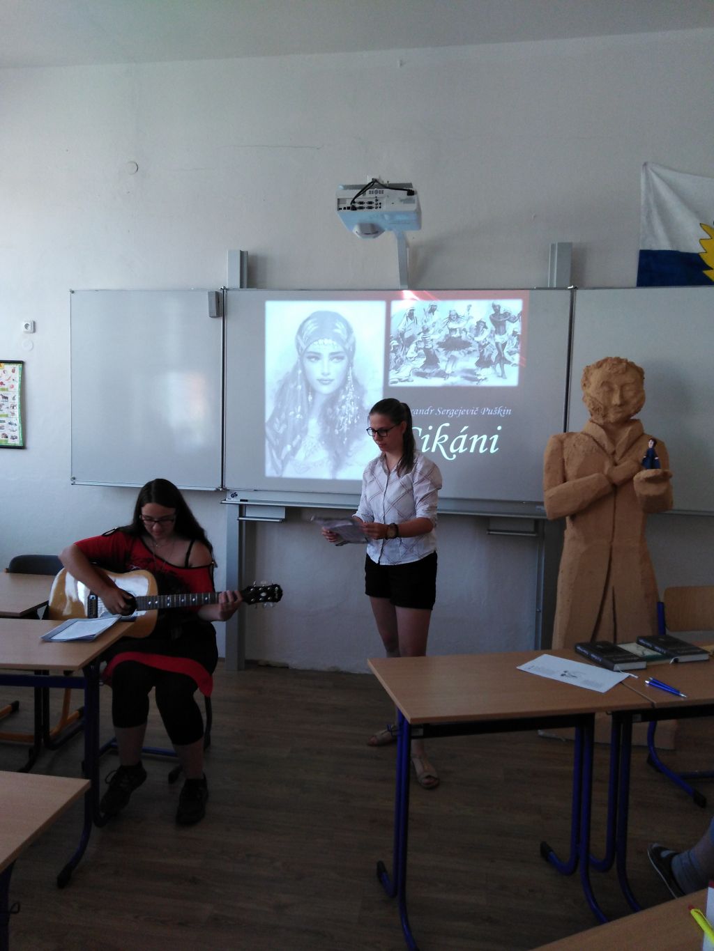 A o kterých Puškinových dílech jsme si povídali? Byly to poémy Měděný jezdec a Cikáni, povídka Kapitánská dcerka, Bělkinovy povídky a samozřejmě román ve verších Evžen Oněgin. Zajímavosti (a dá se říct i pikantnosti) ze života našeho milého Alexandra Sergejeviče odhalila Aneta Šamšulová. Zazněly také ruské cikánské písně v podání Anety Schiffnederové a Šárky Flekové.
