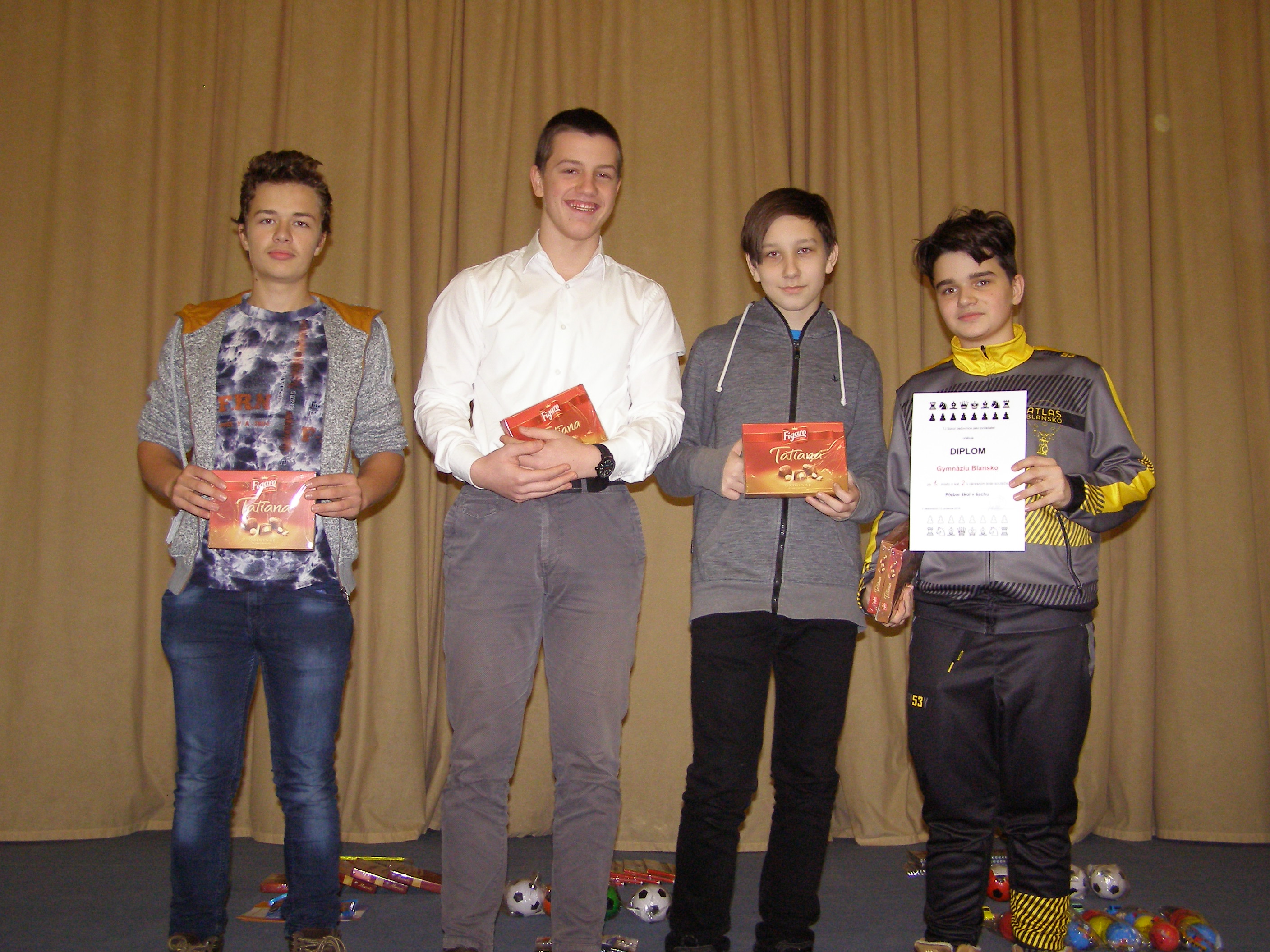 Ve čtvrtek 13. 12. 2018 se v Kulturním domě v Jedovnicích konalo okresní kolo šachového turnaje, na kterém nemohla chybět naše družstva složená z žáků nižšího i vyššího gymnázia. V obou kategoriích (ZŠ i SŠ) naše týmy potvrdily roli favorita a obsadily 1. místo.
