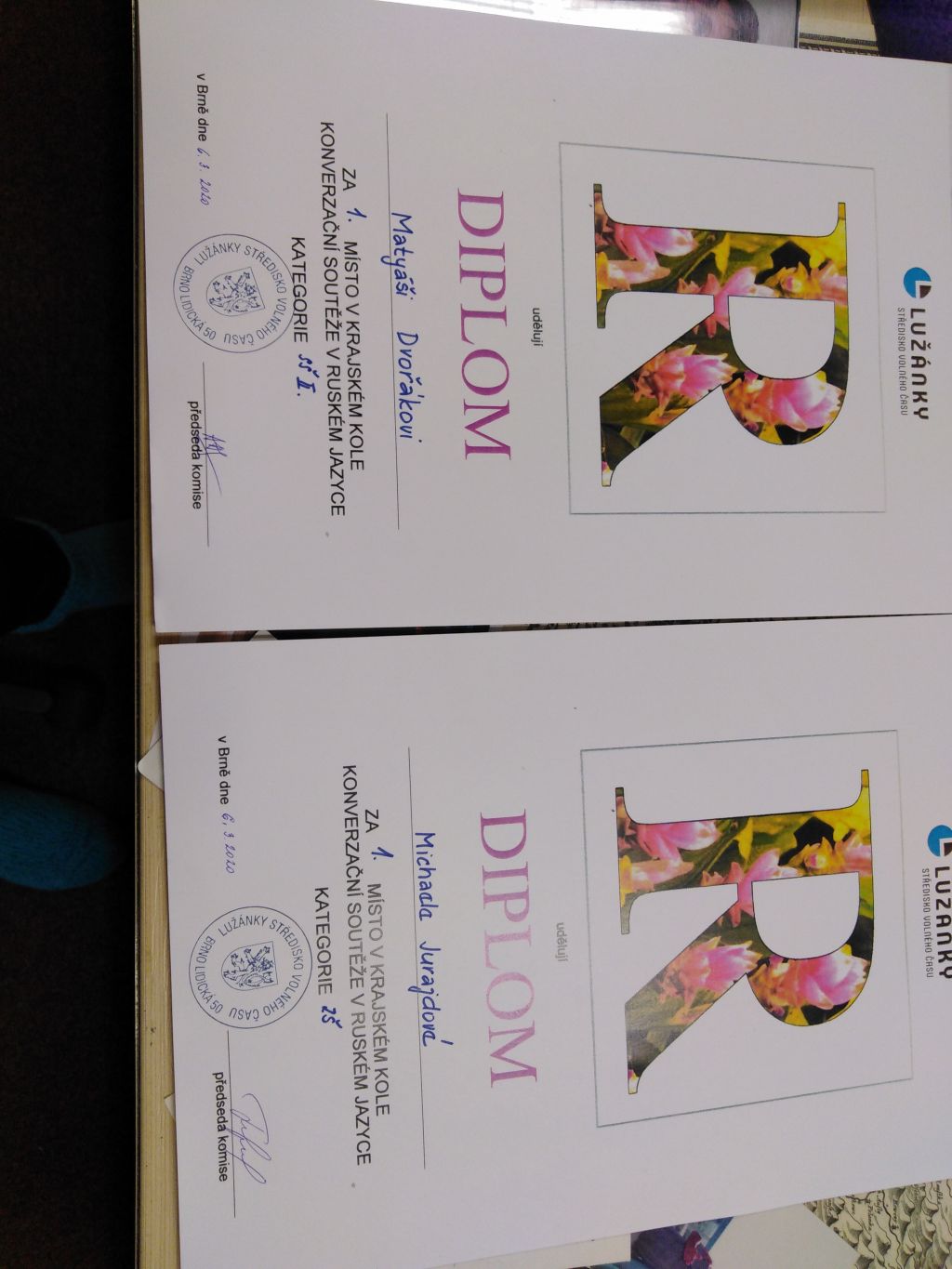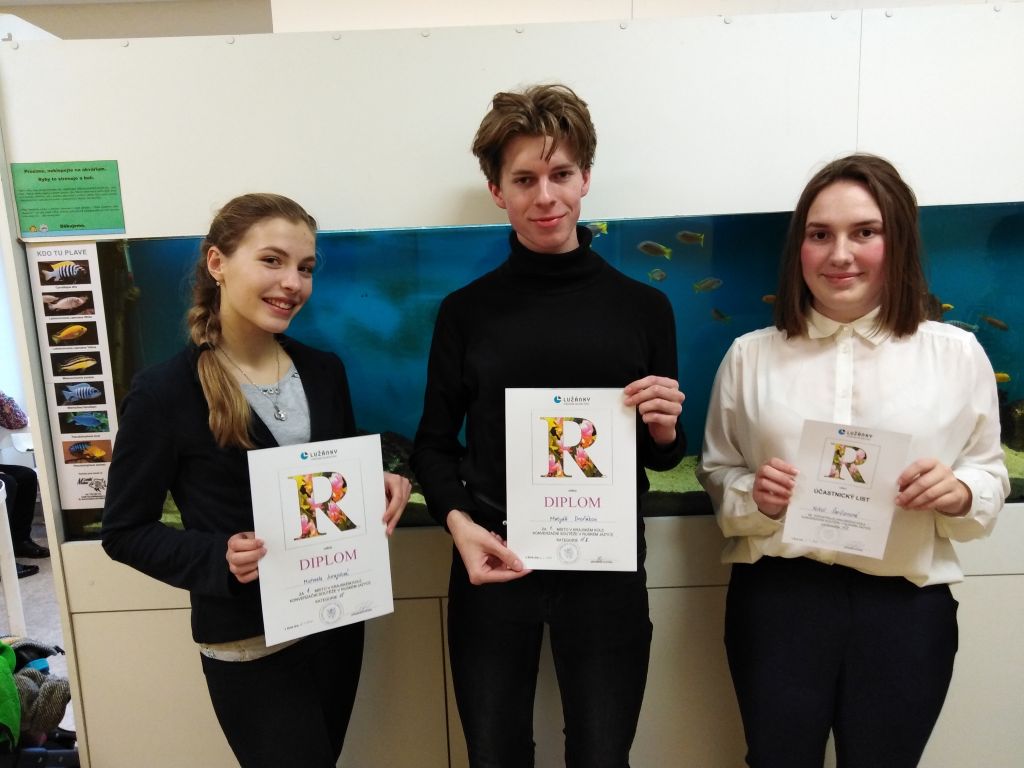 Jmenují se Michaela Jurajdová a Matyáš Dvořák a v pátek 6. března oba vybojovali v Brně v krajském kole Konverzační soutěže v ruském jazyce první místa ve svých kategoriích. Míša z kvarty v kategorii základních škol a víceletých gymnázií (ZŠ/VG) a Matyáš z oktávy v nejprestižnější kategorii studentů třetích a čtvrtých ročníků středních škol (SŠ II).