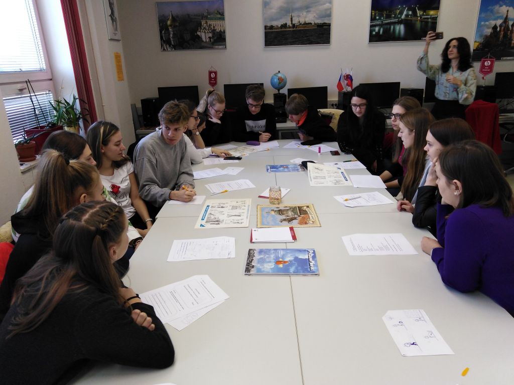 Na místě se jim věnovala vedoucí Centra, rodilá mluvčí a učitelka ruského jazyka na PF MU v jedné osobě, sympatická paní Taťjana Savčenko. Pro naše studenty měla připravený zajímavý a zábavný program – nejprve vyprávěli pomocí vlastnoručně malovaných obrázků o sobě a o svých zálibách, pak sledovali kreslený film z řady Máša a medvěd s tématem Narozeniny, ke kterému dostali pracovní listy, a pak tvořili příběh podle komiksu. Zkrátka nepřišel ani zpěv a recitace ruských písní a básníJ a na závěr zbyl čas i na odpovědi na zvědavé otázky „na tělo“.