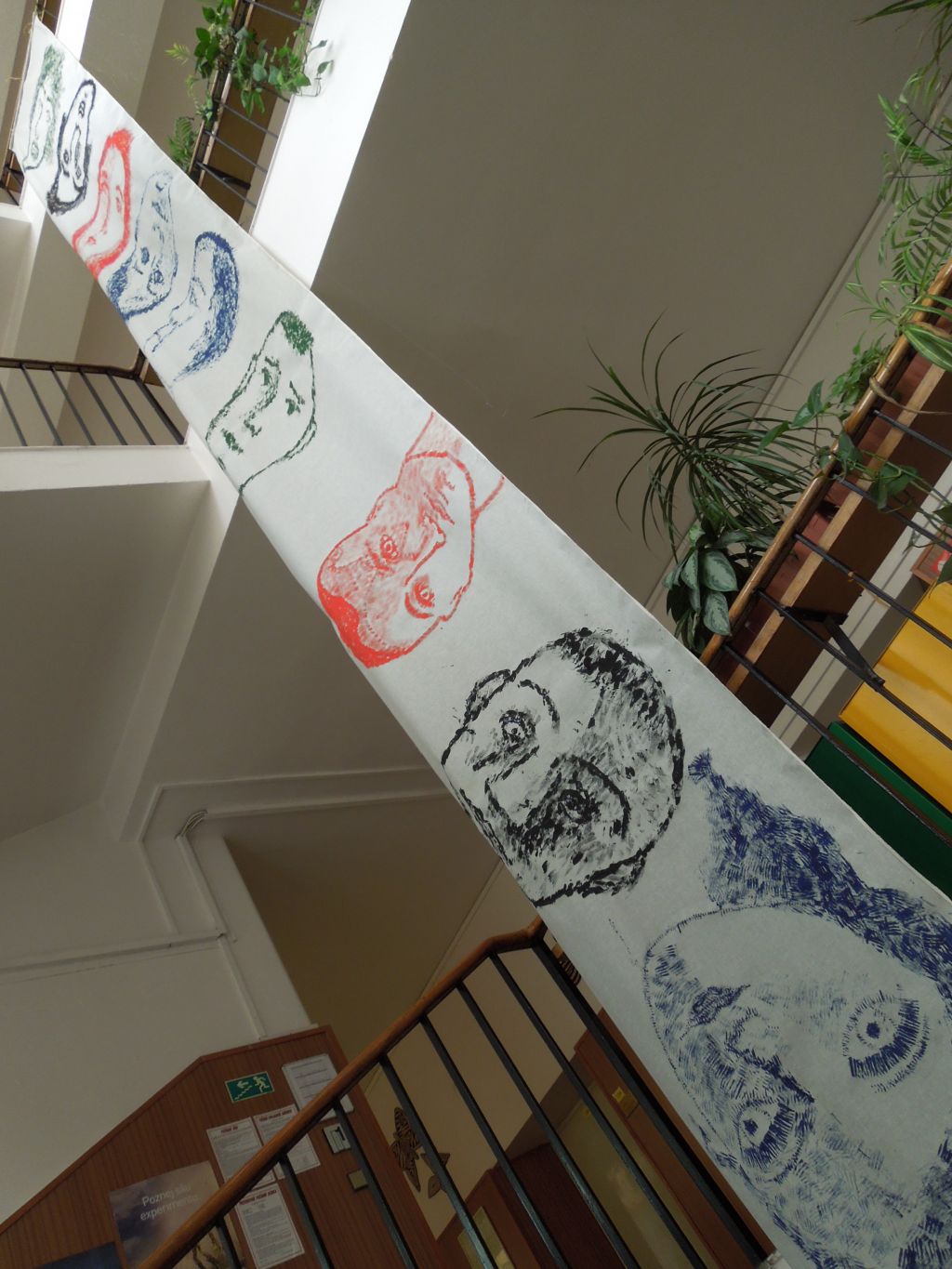 Studenti vyťukávali své portréty starými jídelními příbory. Efektní práce lžícemi a famózní výsledek vidličkami:-)Akci předcházelo focení studentů, práce s portrétem ve třídě, samotná výtvarná akce a konečná instalace. Při instalaci došlo k malému pozastavení "chodu" školy. Procházející studenti zastavovali a pomáhali při přesunu výtvarných děl z přístavby školy i při samotném uchycení portrétů v hlavní budově.
