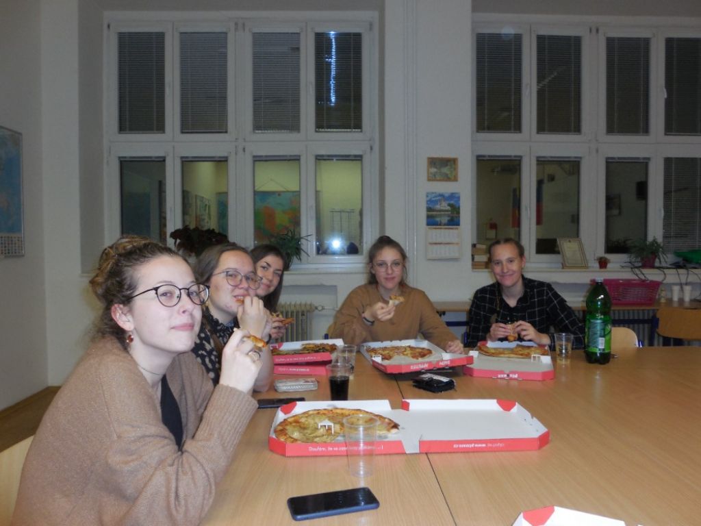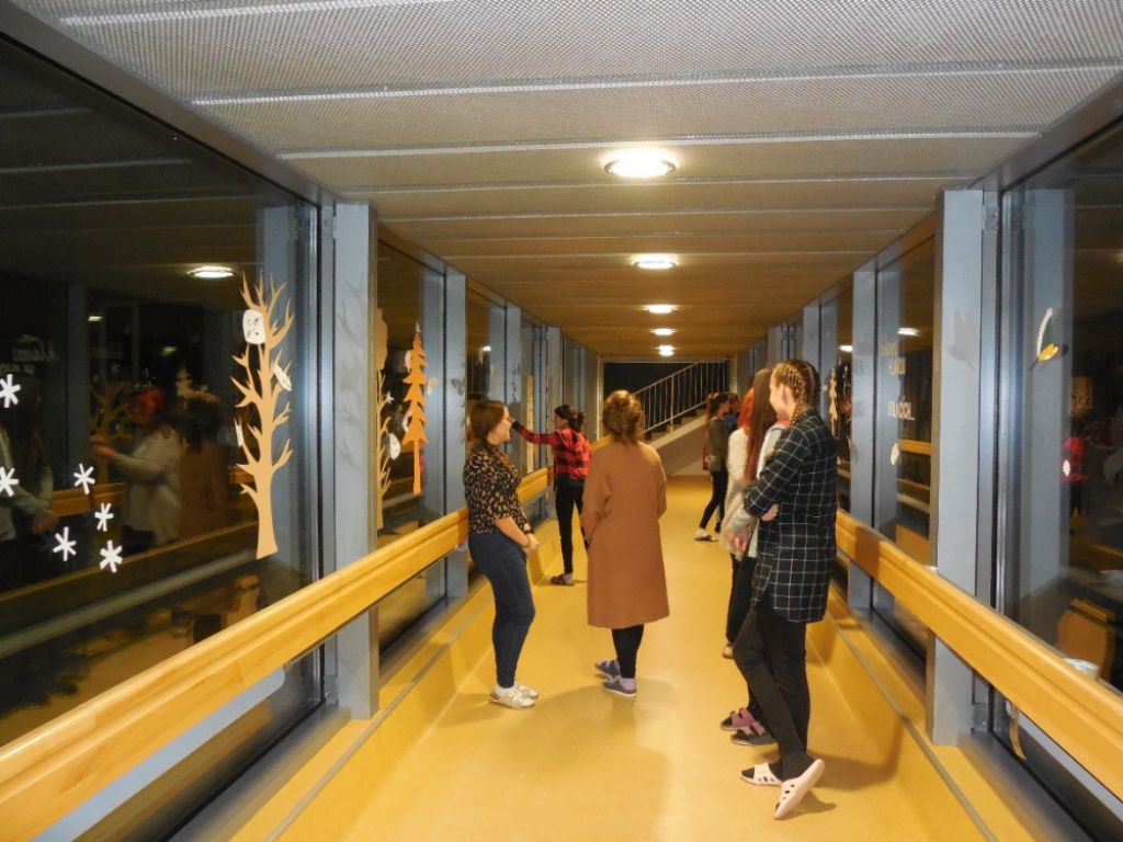 V podvečerních hodinách jsme se podívali i na náměstí Republiky, kde čerstvě svítil vánoční strom. A zatímco venku padal snih, do školy nám přivezli pizzu a začal večerní program. Perličky pod vedením p. uč. Juračkové vytvořily část nové výzdoby v budově bývalé obchodní akademie, ve spojovací lávce přidaly ke stávající výzdobě zimní tematiku.