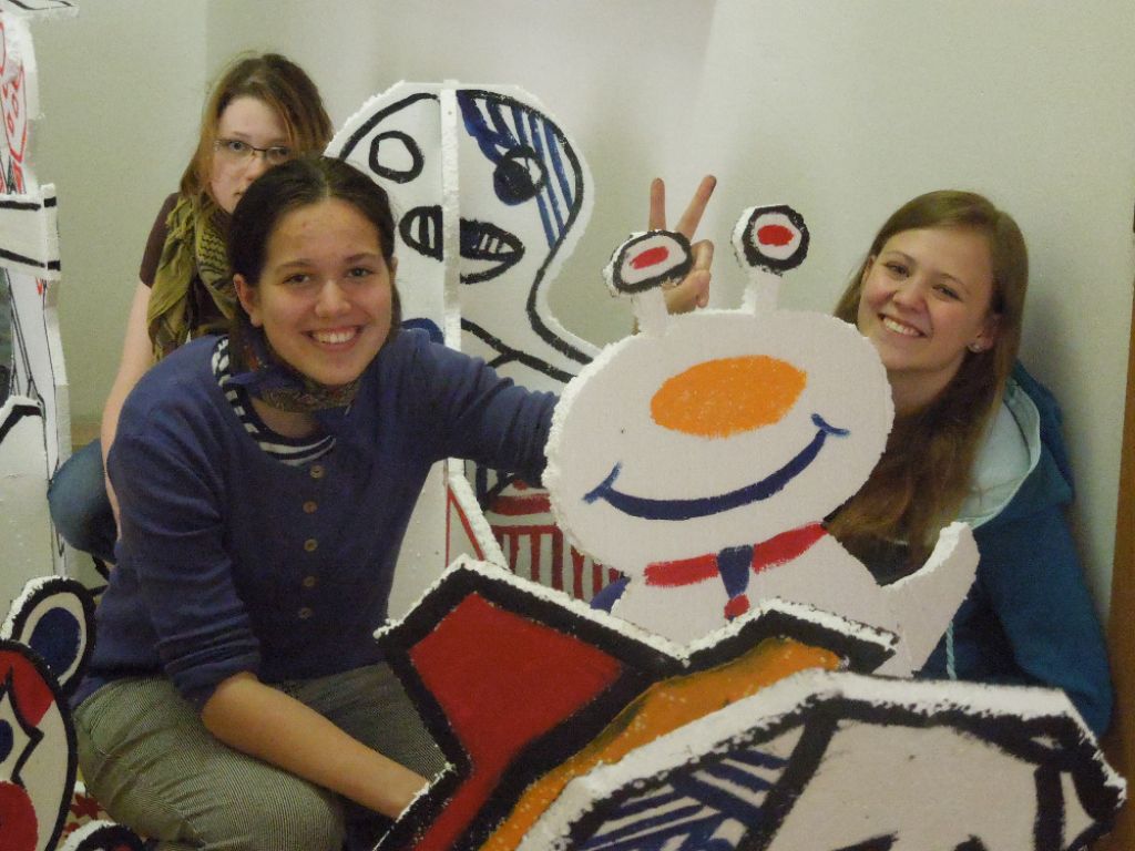 Polystyrenová dílnička - Dubuffet a jeho umění, inspirace jeho prací jako poslední pozdrav z výtvarné dílničky v tomto školním roce. Papíroví paňáci zdobí mezanin hlavní školní budovy.