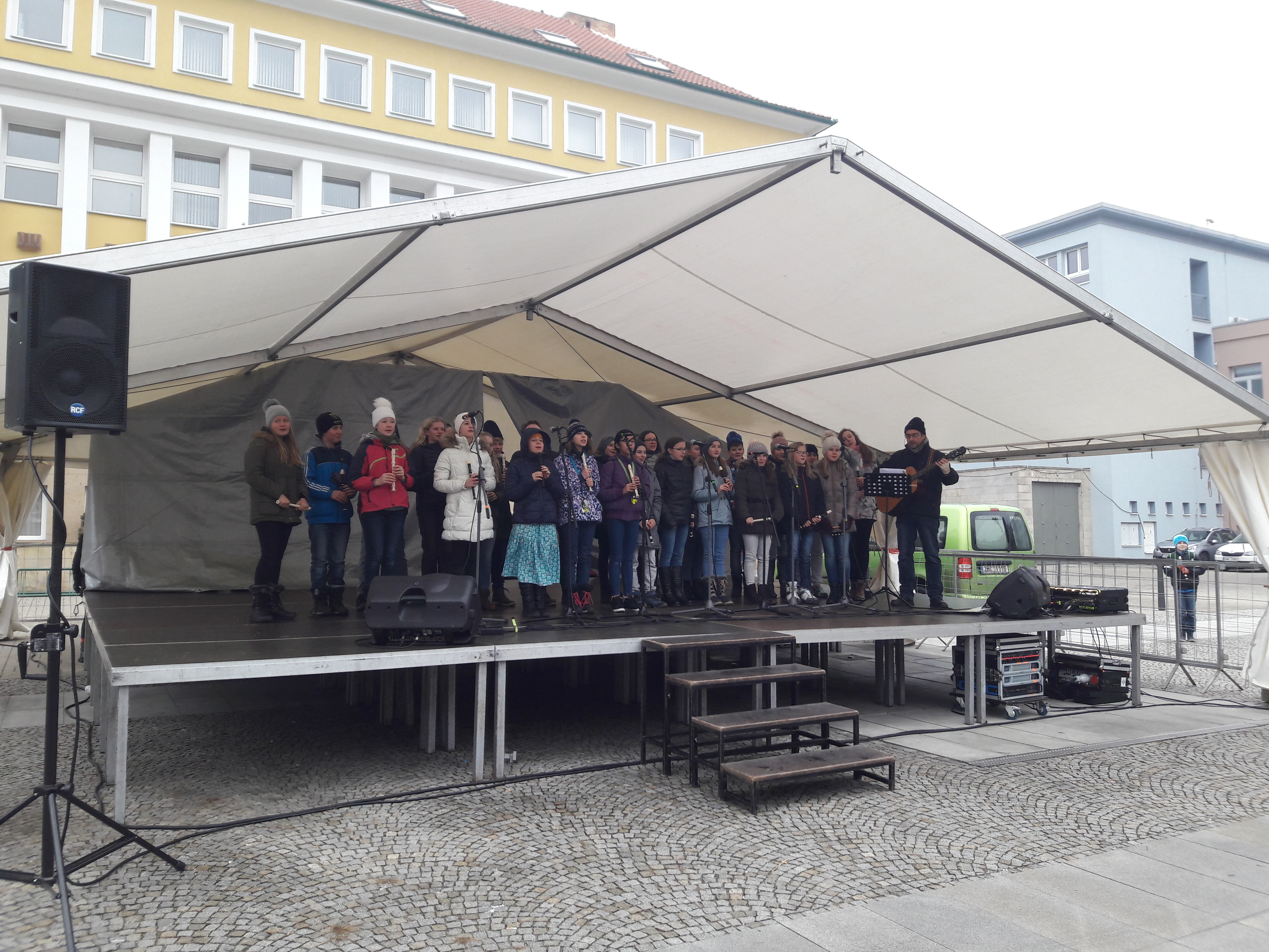 Páteční koncert byl určený pro širokou veřejnost. Koledy v podání primy, sekundy a Perliček oživily v pravé poledne náměstí Republiky okolo vánočního stromu. Gymnazisté využili městské pódium a profesionální zvukař pomohl akci zrealizovat. Závěrečné Rolničky zpívala společně téměř stovka účinkujících.