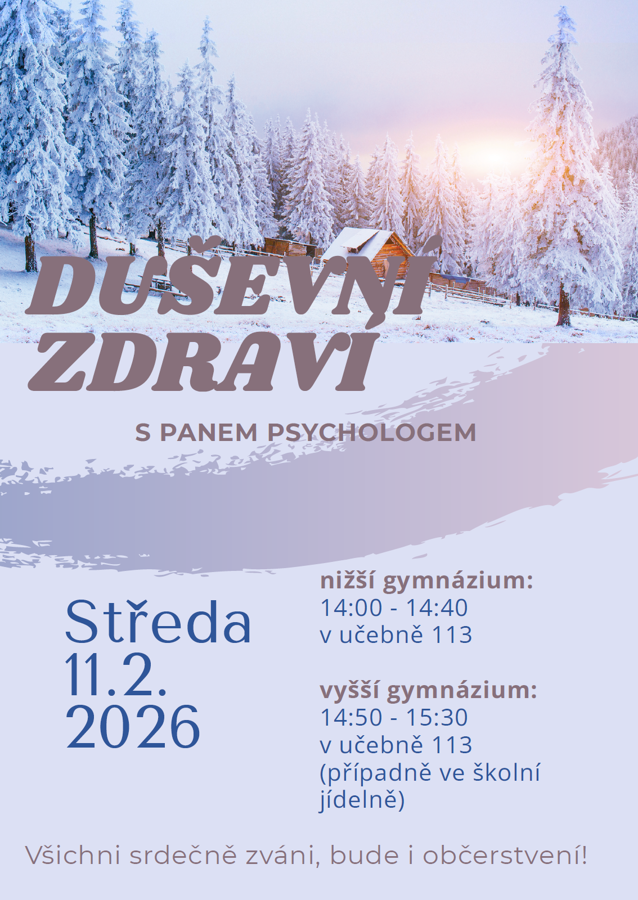 Ve středu 11. 2. 2026 se můžete zúčastnit besedy se školním psychologem panem Martinem Ptáčkem. Tématem bude péče o duševní zdraví.