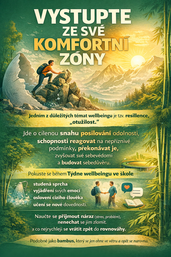 Pokuste se během Týdne wellbeingu ve škole „překonat sami sebe“ a prostřednictvím „malé osobní výzvy“ vystoupit ze své komfortní zóny. Může to být studená sprcha, vyjádření svých emocí, oslovení cizího člověka nebo učení se nové dovednosti.